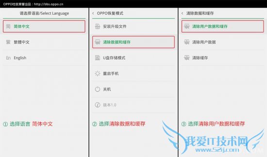 然后关闭手机,同时按住音量减不松开,接着按住开机键即可进入下图所示的“OPPO恢复模式”