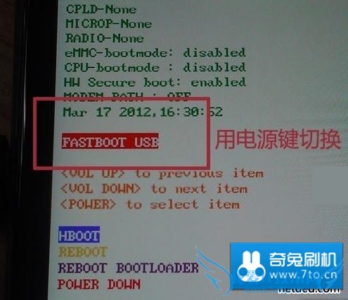 1:把手机关机,然后在关机状态下按住手机的 音量下键 和 电源键 进入HBOOT模式,然后按音量键选择FASTBOOT,然后按电源键确认,进入FASTBOOT界面