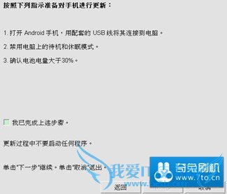 9:将显示一条确认信息,表明在 Android 手机上安装必要文件 (包括无线电通讯模块映像) 所需时间。单击下一步开始更新。更新过程中,屏幕上会显示不停变化的进度条。