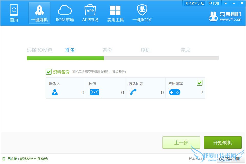 2.点击【一键刷机】,可以选择你要刷的酷派8295M移动版 ROM包,如果你还没有下载手机的刷机ROM包,可以在奇兔刷机ROM市场下载。选择好手机的刷机ROM包之后,进入资料备份界面,刷机会清除联系人, 短信, 通话记录和应用程序,建议大家备份,刷机后可以还原。