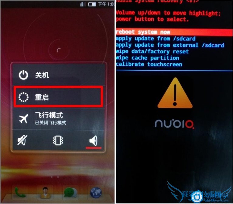 步骤3: 按开关机键,选择“重启”手机,在重启过程中一直长按音量上键进入recovery模式,如图所示: