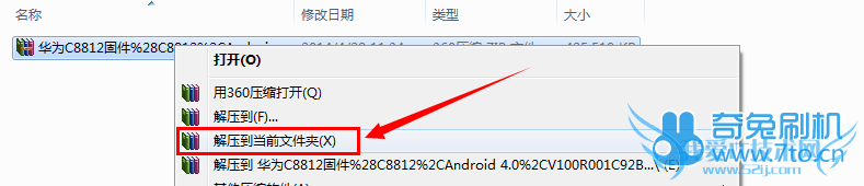 2:下载后解压,右键点击你下载的固件包,选择【解压到当前文件夹】(这里我用C8812做示范,不同型号手机下载的固件不同,不要纠结这个)