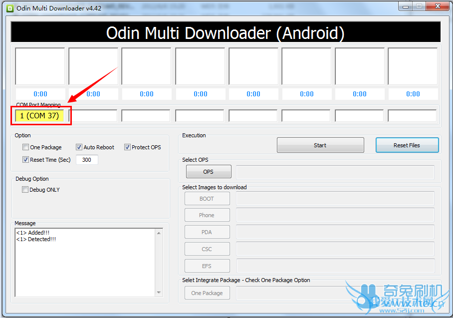 下载后解压,然后运行Odin Multi Downloader v4.38.exe 如果像下图红框中显示【COM XX】(xx可以是任何数字,不影响)。证明三星G3509 (Galaxy Trend 3 电信版)手机已经连接好。可以刷机。如果没有显示,那就手动为三星G3509 (Galaxy Trend 3 电信版)安装驱动,查看如何安装手机驱动图文教程。
