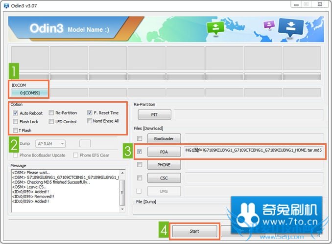 点击 PDA 按钮,选择固件CTC-I869KESAND3文件夹下的 G7109KEUBNG1_G7109CTCBNG1_G7109KEUBNG1_HOME.tar.md5 ;