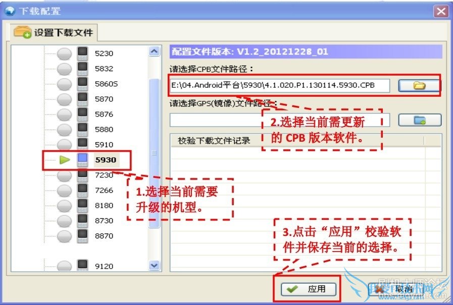 4、点击“配置”,设置下载文件,选择5930;选择CPB文件路径为你下载的“XX***X.CPB”,点击“应用”。