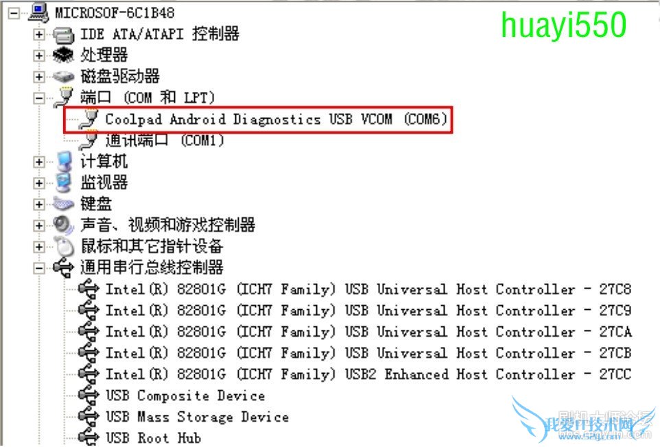2、手机关机(装电池)按住“音量上键”的同时,通过标配数据线把手机连接至电脑。安装Coolpad5930_Drivers.exe。然后通过电脑发现的未安装新硬件,自动完成端口驱动的安装;硬件更新向导需要重复几次安装操作,如下图示:(设备管理器中安装成功的设备驱动)。