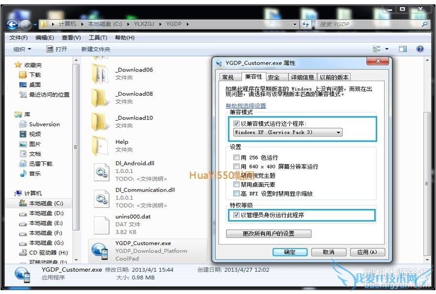 1、安装 YGDP_Setup_V2.11_130329_01_Customer.exe,按照提示点击下一步完成即可,Windows7及64位系统如遇兼容性采用如图所示解决办法(WIN7系统运行无响应,可以“管理员身份运行、兼容XP SP3模式运行“)