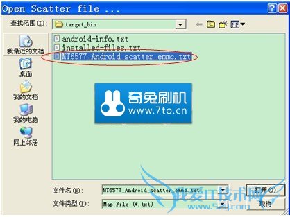 4.然后点击软件上的Scatter-loading按钮选择软件对应的文件,然后在弹出来的选择窗口中选择刚才解压出来的【联想P770 中文recovery文件】文件夹中选择MT6577_Android_scatter_emmc.txt