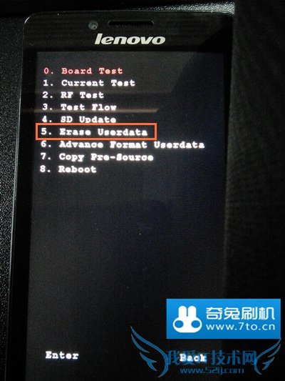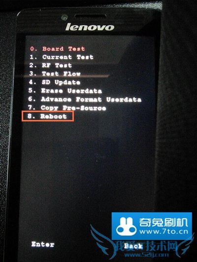 7.待erase完成后,会自动返回烧机模式界面,选择第八项“Reboot”,再点击左下角enter,手机会自动重新开机,完成T卡升级。