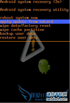 6:然后按音量上下键移动,移动至“ apply update from sdcard “,如果你的recovery里没有这一项,那就选择“ apply update from external storage“,按开机键进行确认
