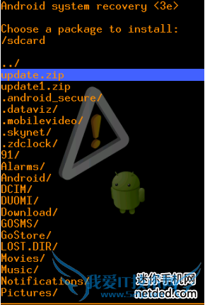 7:然后在出现的列表中选择“update.zip”文件,然后按开机键进行确认,之后就开始刷机了