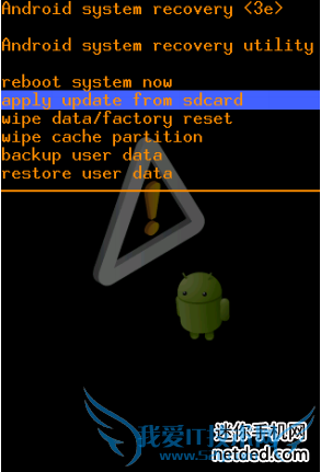 6:然后按音量上下键移动,移动至“ apply update from sdcard “,如果你的recovery里没有这一项,那就选择“ apply update from external storage“,按开机键进行确认
