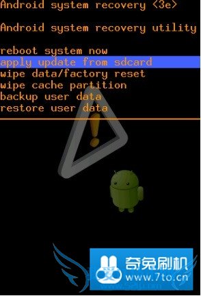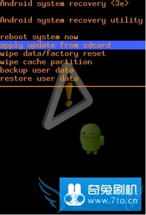 手机在关机状态下,同时按下音量上键 + 开关机键,进入recovery模式“install zip from sdcard”再选择SD卡内的“recovery-update.zip”即可