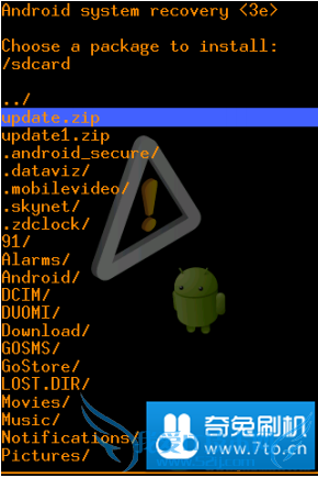 选择“update.zip”文件,然后按开机键进行确认进行刷机