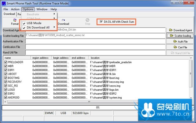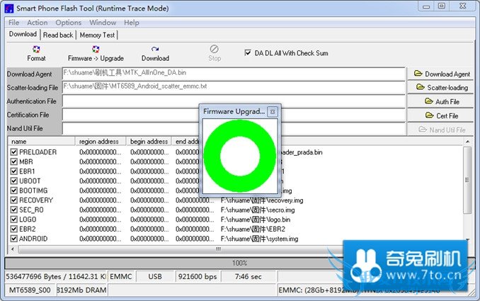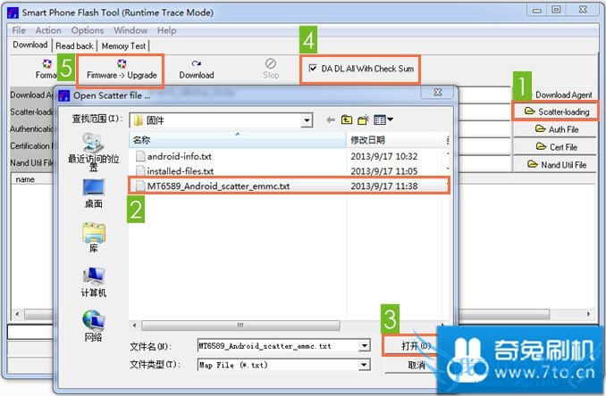 选择固件文件夹下的相关文件,勾选 DA DL All With Check Sum ,点击"Firmware -> Upgrade"
