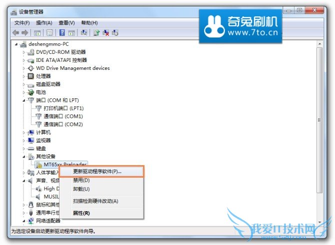 此时设备管理器会出现一个带问号的设备,对其右击“更新驱动程序”(有些手机可能会一闪而过,需要抓紧时间右击!)