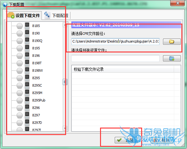 3.点击主窗口菜单栏左上角的“配置”菜单,配置下载文件选择: 8295m,选择正确的 CPB文件后, 点击“应用”键,CPB 文件校验成功后保存软件。