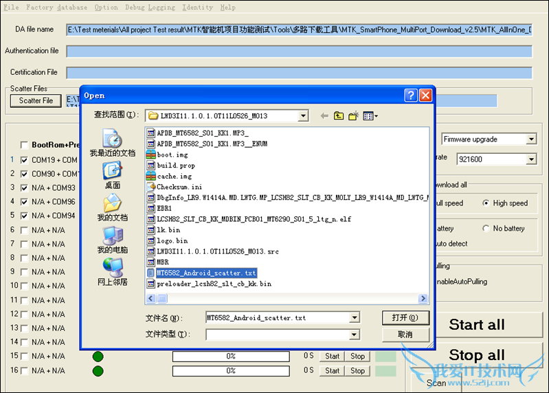1.双击MTK_SmartPhone_MultiPort_Download_v2.5文件夹中的SPMultiPortFlashDownloadProject.exe升级工具,点击scatter File,选择手机升级软件包里的scatter文件(MT6582_Android_scatter.txt)如下图所示: