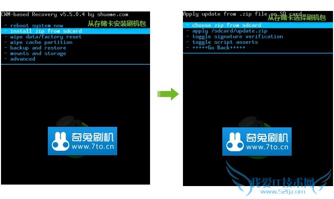 - install zip from sdcard 从存储卡安装刷机包 - choose zip from sdcard 从存储卡选择刷机包