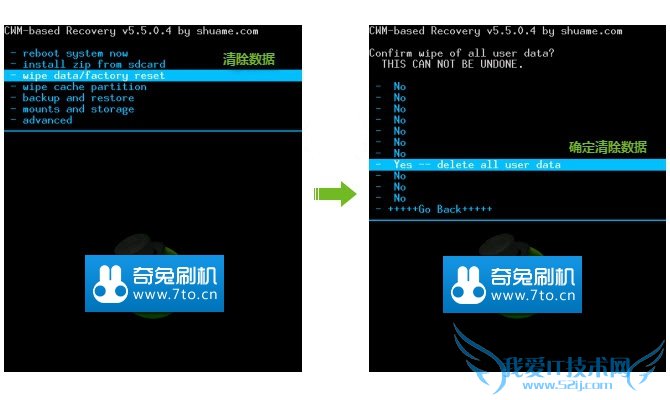 - wipe data/factory reset 清除数据 - yes -- delete all user data 确定清除