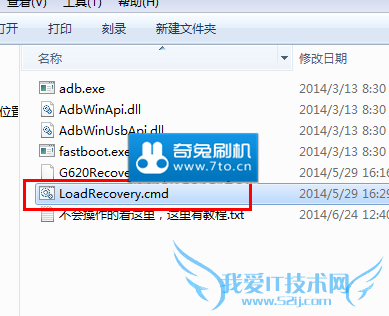 4.接着在解压出来的文件夹里找到【LoadRecovery.cmd】文件,然后直接双击打开运行,手机会自动重启,请耐心等待,直到手机出现recovery界面。