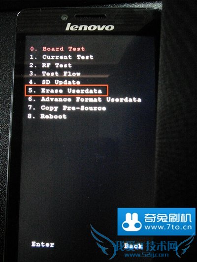 6.通过按音量上下键,选择界面第五项“erase userdata”,然后点击左下角“enter”,进入erase userdata…界面,再点左下角“SRART”,进行erase;