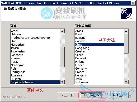 3.出现“选择语言/国家”界面,左面是选择语言,我们选择“Simplified Chinese”即“简体中文”,右侧是选择国家地区,我们选择“China”即“中国大陆”,选择完毕后点击【下一步】继续安装。