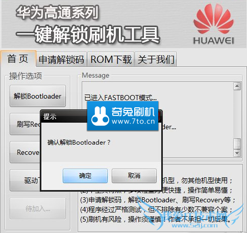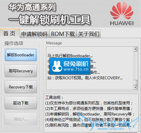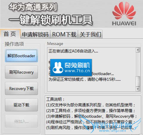 奇兔ROM市场小编在这里跟大家分享一下华为G620-L75(G620移动4G版)解锁教程,华为G620-L75(G620移动4G版)解锁教程采取一键解锁的方式,虽然网上也有华为G620-L75(G620移动4G版)其它的解锁教程,但是相比较而言华为G620-L75(G620移动4G版)解锁教程更简单易操作,如果你的华为G620-L75(G620移动4G版)手机还没有解锁,就一起来看看详细的华为G620-L75(G620移动4G版)解锁步骤吧: