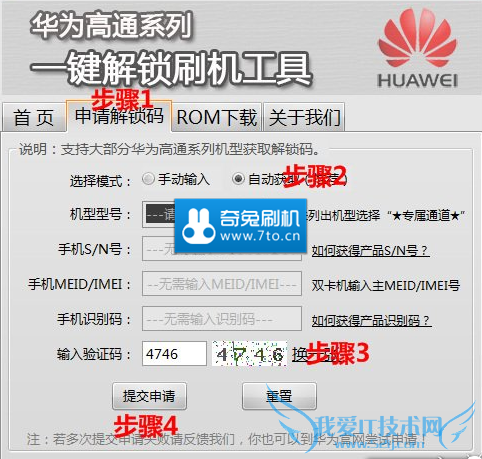 3.手机通过数据线连接电脑,打开解锁工具,然后选择“申请经解锁码”--“自动获取”--“输入验证码”--“提交申请”,大概10秒左右,解锁**以文本形式保存在桌面;如图所示: