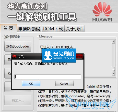 5.数据线连接电脑,打开一键解锁工具,点击“解锁Bootloader”,点击“确定”,出现一个对话框,输入16位解锁码,点击“确定”,一键解锁工具没有任何异常提示,手机顺利重启即解锁成功;如图所示:
