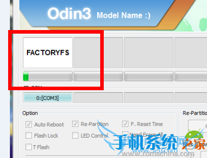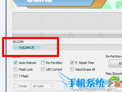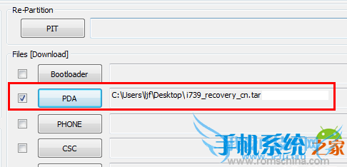4.打开odin软件之后软件会自动识别你的手机,识别成功后会在ID:COM处显示蓝色的(表示手机连接成功了,如果没有显示蓝色的,说明没有有连接好),然后勾选PDA,选择刚才下载下来的tar格式的recovery包;