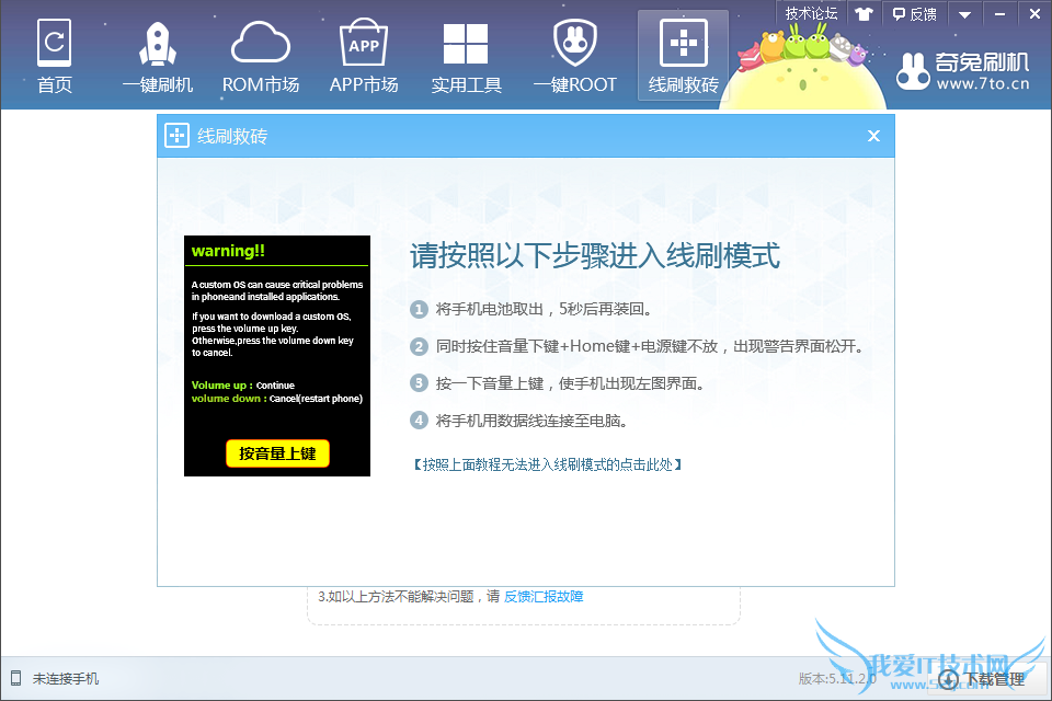3、按照弹出的提示进入小米红米NOTE移动4G增强版(单卡版)线刷模式,期间要保持小米红米NOTE移动4G增强版(单卡版)手机正常连接状态!