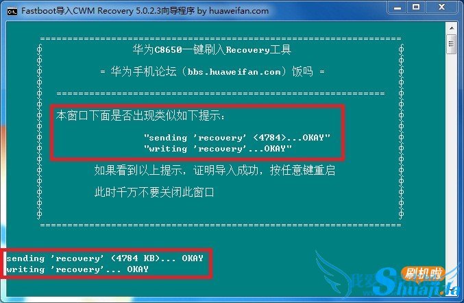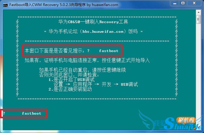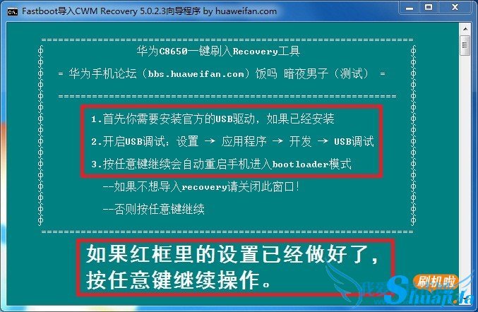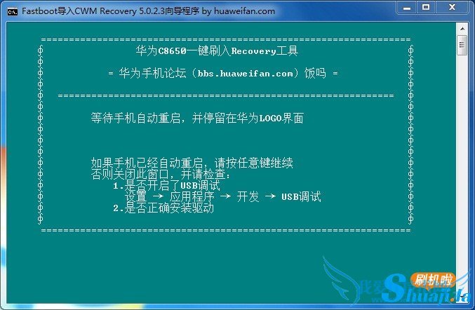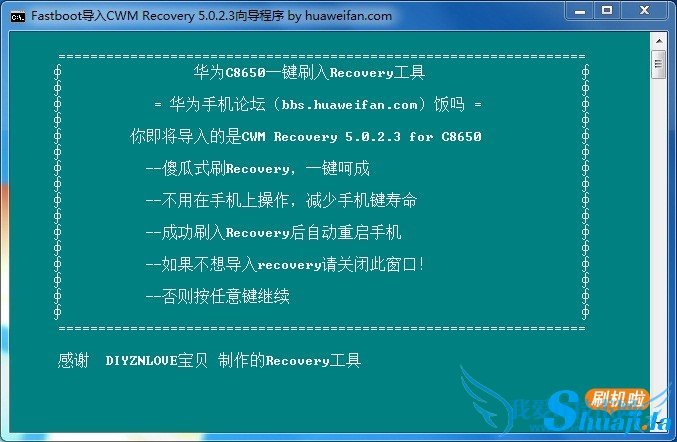 2.打开解压下载好的华为C8650一键刷Recovery工具,CWM recovery 5.0.2.3工具.exe根据提示进行操作。