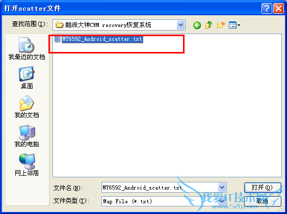 2、你的酷派8295M移动版线刷包解压到哪里,你在下图的对话框里面找到那个位置,选择打开图中一样名字的TXT文件“MT6592_Android_scatter.txt”,然后确认打开!