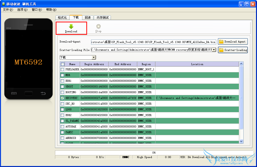 这时候,点击图中红框的按钮“download(下载)”,现在你就需要迅速将USB数据线插入到手机,这时候进度条就会开始走了。