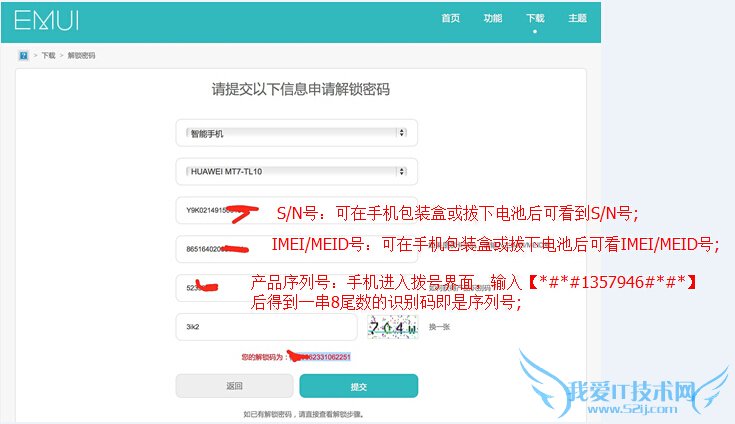 步骤3:在解锁码申请页面填写手机的相关信息。如下图提示