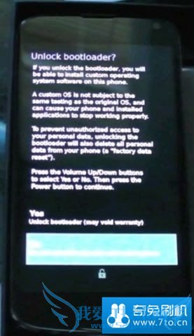 问你确定解锁bootloader? 用音量加减选择,电源键确认。 选到Yes等待软件界面显示ok后,表示你解锁成功了