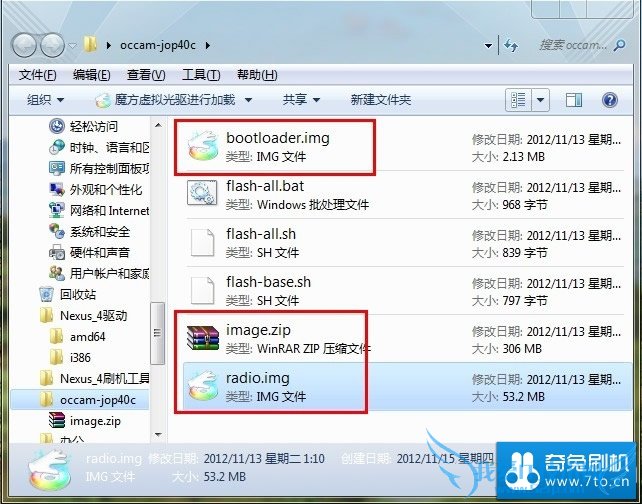 4.把以上改好名字的 三个东西,分别为 bootloader.img ; image.zip ; radio.img 复制到刚才解压出来的 Nexus_4刷机工具箱 下面,如下图