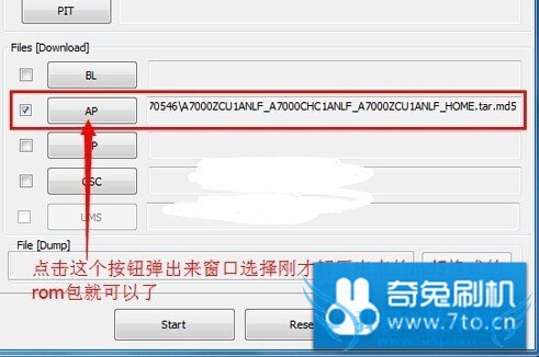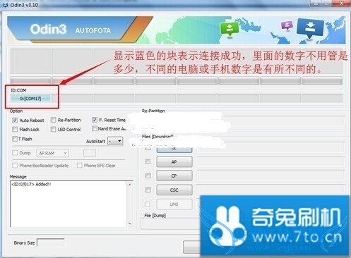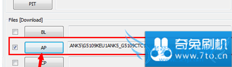 4:打开odin软件之后软件会自动识别你的手机,识别成功后会在ID:COM处显示蓝色的(表示手机连接成功了,如果没有显示蓝色的,说明没有有连接好),然后勾选AP,选择上面下载并解压出来的md5格式的rom包。