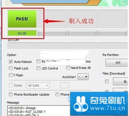 6:刷完之后,上面会显示【PASS】字样就表示刷入成功了。