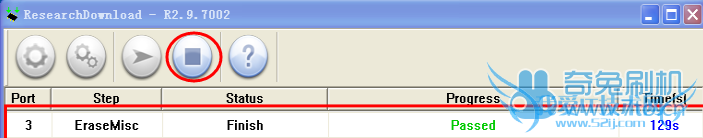 4. 状态栏提示“Passed”时,表示升级完成,此时可进行下一台的升级;注意:所有机器下载完成后需要点击菜单 停止 按钮停止升级,以防止装载手机后误升级;