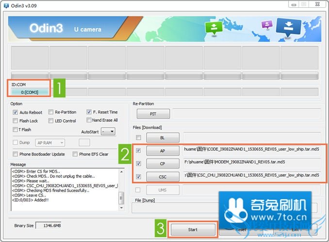 点击 AP 按钮,选择固件文件夹下的 CODE_I9082ZNAND1_1530655_REV05_user_low_ship.tar.md5 ;点击 CP 按钮,选择固件文件夹下的 MODEM_I9082ZNAND1_REV05.tar.md5 ;