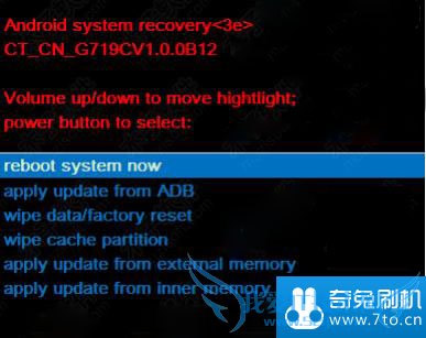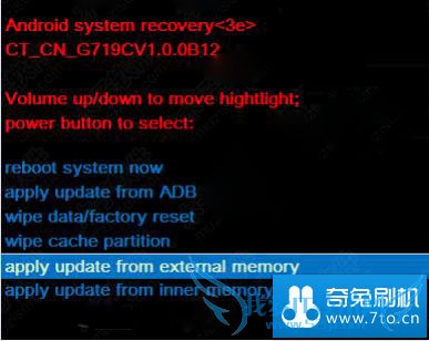 2.选择【apply update fROM external memory】(inner memory是内置存储,有些写的是external sdcard外置存储),刷机包放在什么位置就选什么位置)从外置SD卡上读取刷机包,在recovery模式下使用音量键选择,电源键确认。