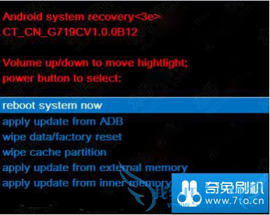 1 首先将下载下来的刷机包文件解压,得到「update.zip」文件,将其拷贝到SD卡根目录,然后手机关机进入Recovery模式(关机状态下同时按住:音量上、开机键进入recovery模式),如图: