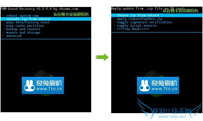 - install zip from sdcard 从存储卡安装刷机包 - choose zip from sdcard 从存储卡选择刷机包