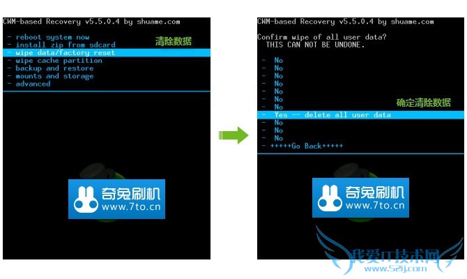 - wipe data/factory reset 清除数据 - yes -- delete all user data 确定清除