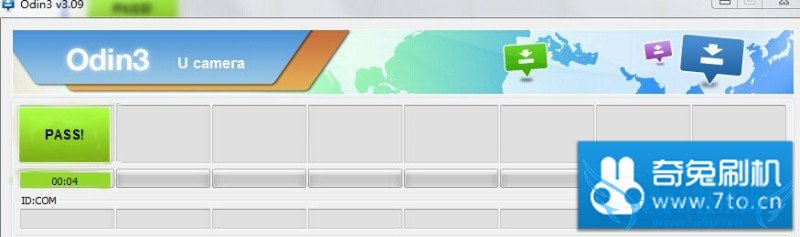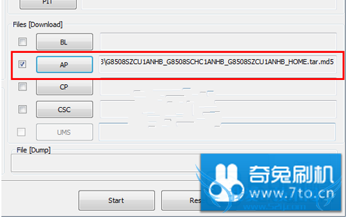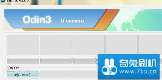 6.打开odin软件之后软件会自动识别你的手机,识别成功后会在ID:COM处显示蓝色的(表示手机连接成功了,如果没有显示蓝色的,换个usb口试试,或者看下驱动有没有安装好),然后勾选PDA(新版本的是AP)选择上面下载的tar格式的刷机包
