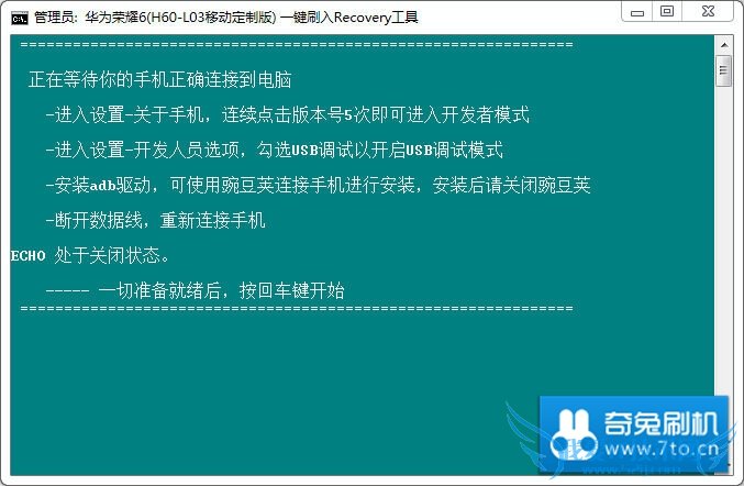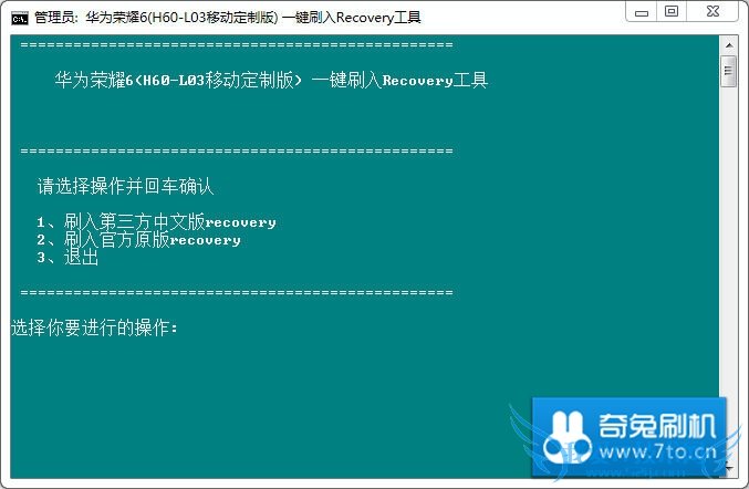 打开 一键刷入recovery 文件夹下的 一键刷入H60-L03移动定制版rec.bat,运行后如下图: