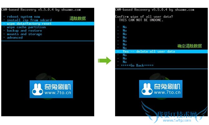 - wipe data/factory reset 清除数据 - yes -- delete all user data 确定清除