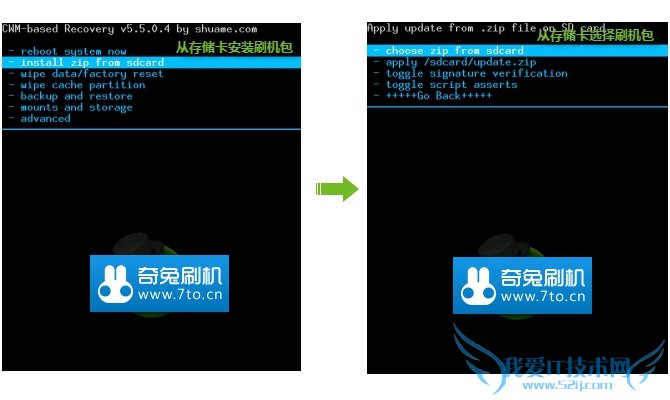 - install zip from sdcard 从存储卡安装刷机包 - choose zip from sdcard 从存储卡选择刷机包